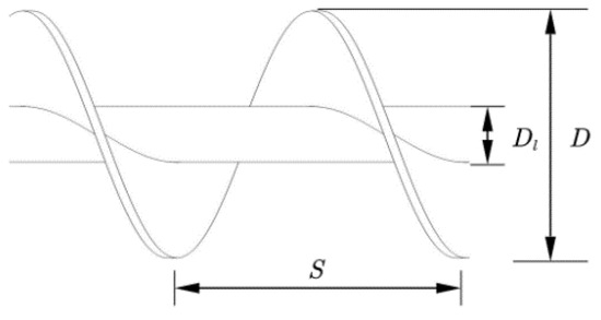 The screw conveyor is a continuous conveying equipment that uses rotating spiral blades to push materials for forced conveying. Under the condition of ensuring sufficient and stable feeding, the material in the device has a stable filling coefficient [27]. Under this condition, the output of the material can be controlled by controlling the advancement speed of the material in the device. Therefore, controllable quantitative output of seeds can be achieved by designing the spiral auger parameters rationally. The structure of the spiral auger is shown in Figure 4.