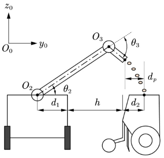The main design parameter of the supply-robot arm is the length of each link [23,24]. The length of the waist-joint link is mainly determined using the frame size and the relative height of the seeder and the ground. The small arm link is mainly responsible for adjusting the inclination angle of the discharge port, so the docking range is mainly determined using the length of the big arm link. Due to limitations in the range of motion of the joint drive components and the joint structure, the maximum design angle of the big-arm joint is 45°, and the angle range during normal operation is usually 0~30°. During operation, a safe distance of about 1 m should be left between the two machines to prevent interference between vehicles. In order to meet the above operation requirements, the following requirements should be met: