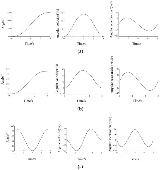 At this point, the interpolation function for trajectory planning under joint angles is obtained. Set the straight-line trajectory of the outlet coordinates from the right positioning point (355, 1575, 2741) to the middle point (−480, 1541, 2741) and then to the left positioning point (−1186, 1095, 2741). The total time is set to 8 s; use the trajectory of the third stage to verify the planning results. Calculated using the inverse kinematics equation, the joint angle coordinates corresponding to each point are (60°, 45°, −45°), (90°, 45°, −90°), (120°, 45°, −45°); the first-stage motion trajectory under this target point is used to verify the planning effect of θ2. Write a program and draw the image in MATLAB, and obtain the relationship between the angle, angular velocity, and angular acceleration of each joint with time under this trajectory, as shown in Figure 6.