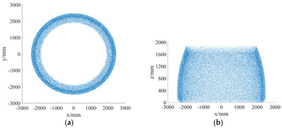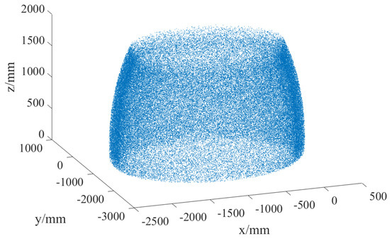 The workspace is an important basis for measuring the working performance of the supply manipulator. The Monte Carlo method [30,31] is used to verify the workspace of the manipulator. The joint angles of the manipulator are randomly traversed within the permitted value range. The kinematic equations are solved to obtain the corresponding end-point position of the robotic arm at each joint angle to form its workspace. Write programs in MATLAB software to draw three-dimensional and two-dimensional cross-sections of the workspace, use the Rand function to generate random values within the value range of each joint angle, and solve the corresponding spatial coordinates of the end points through the forward kinematics equation. Take the values and plot in the spatial coordinate system in the form of a point cloud diagram. Take the random number of points N = 100,000 and draw the three-dimensional workspace and planar workspace of the robotic arm, as shown in Figure 7 and Figure 8.
