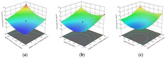 Response surface of the impact of interactive factors on conveying loss rate. (a) Speed of screw conveyor and angular velocity of lumbar joint. (b) Angel of big arm and angular velocity of lumbar joint. (c) Angel of big arm and speed of screw conveyor.