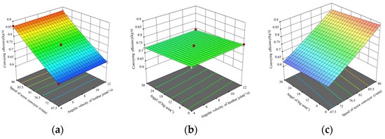 Response surface of the impact of interactive factors on conveying efficiency. (a) Speed of screw conveyor and angular velocity of lumbar joint. (b) Angel of big arm and angular velocity of lumbar joint. (c) Angel of big arm and speed of screw conveyor.
