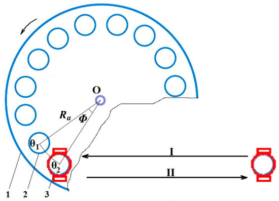 Aspects of distribution and planting movements: (1) distribution apparatus disc; (2) receiving tube; (3) planting device; I—return stroke; II—planting stroke; Ra—the radius of the distribution apparatus at the centers of the receiving tubes Φ—the angle at the center corresponding to the arc θ1θ2 described by the distribution apparatus disc for supplying a seedling to the planting device.