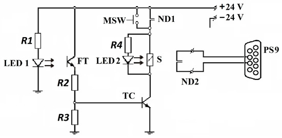Electronic control block: R1—2 kΩ electrical resistance; R2—8 kΩ electrical resistance; R3—0.560 kΩ electrical resistance; R4—2 kΩ electrical resistance; LED 1—light in infrared emission; LED 2—light in infrared phototransistor; MSW—micro-contact; TC—control transistor; ND1—normally open contact; ND2—normally open contact; S—solenoid; PS9—PC nine-pin serial port.