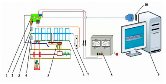 Installation diagram for measuring the return time of the planting device: (1) planting device; (2) distribution apparatus; (3) scotch-yoke device; (4) infrared phototransistor; (5) data acquisition board; (6) micro-switch; (7) DC power supply; (8) computer; (9) serial port; (10) infrared LED.