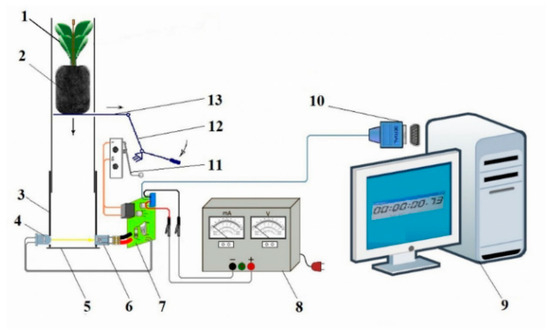 The seedling’s fall time was measured by triggering a computer timer with a micro-switch when the lever system was actuated, releasing the seedling simulacrum [3]; the timer was stopped when the substrate passed between the infrared LED and photoreceptor, thus interrupting the IR beam. The auxiliary installation is presented in Figure 7.