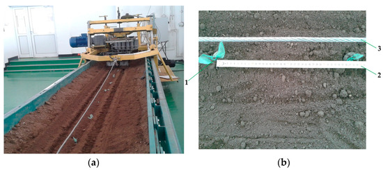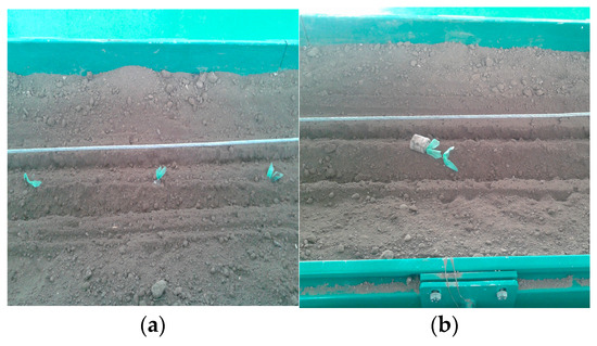 The soil bin shown in Figure 8 [30] was equipped with a trolley on which the tested prototype was mounted. The horizontality and working depth of the planting equipment may be adjusted using screw mechanisms.