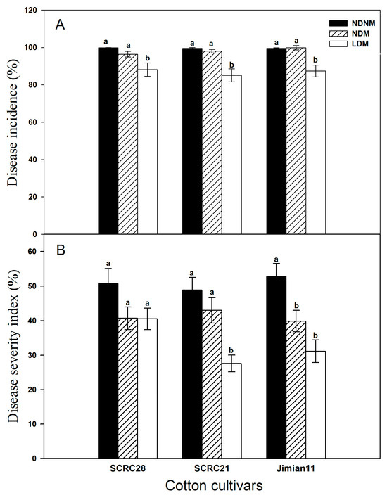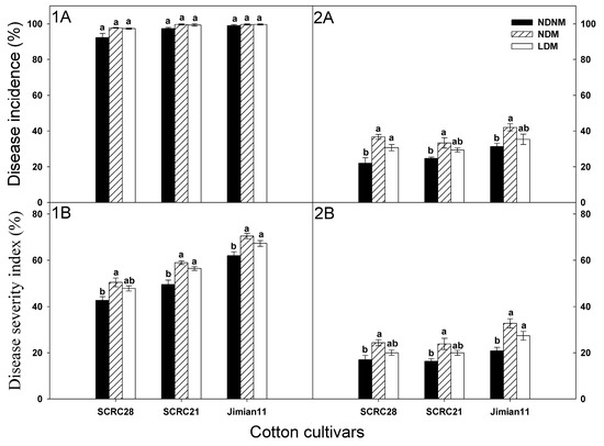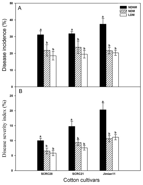 The DIs and DSIs of Fusarium wilt for all cultivars were generally higher in the NDNM treatment than in the NDM and LDM treatments, but no significant differences were observed between the LDM and NDM treatments (Figure 3).