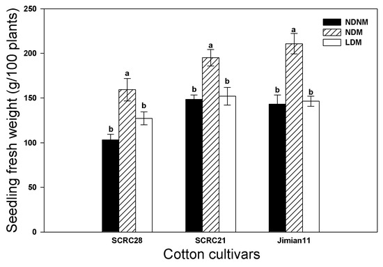 The average seedling fresh weight per 100 plants of the NDM treatment was increased by 56.17 g, 46.71 g, and 67.61 g in comparison to the NDNM treatment for SCRC28, SCRC21, and Jimian11, respectively. However, there were no significant differences between the LDM and NDNM treatments for all the cotton cultivars.