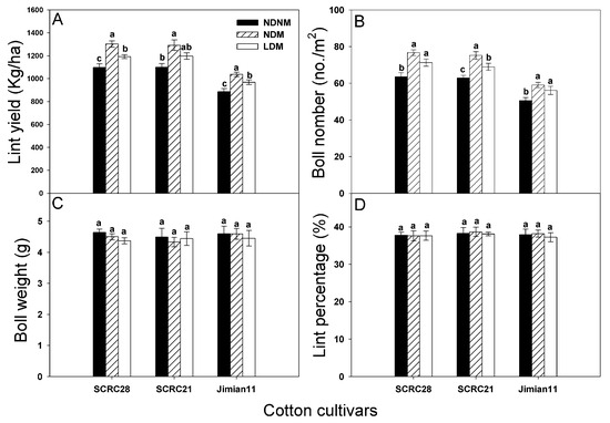 The average lint yields for the NDM treatment were increased by 18.52%, 17.56%, and 17.00%, and samples from the LDM treatment increased by 8.51%, 8.97%, and 9.25% in relation to the NDNM treatment in SCRC28, SCRC21, and Jimian11, respectively. The boll numbers per square meter in the NDM treatment were increased by 20.70%, 19.58%, and 16.85%, and those in the LDM treatment increased by 12.18%, 9.69%, and 10.96%, compared with the NDNM treatment for SCRC28, SCRC21, and Jimian11, respectively.