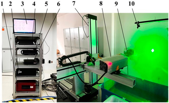Droplet parameter measurement platform. 1. Power supply 2. Data management computer 3. AIMS 2.3.0.1 system software 4. Signal processor 1 channel 5. Signal processor 2 channel 6. Signal processor 3 channel 7. 3-axis positioning and moving system 8. Optical transmitter 9. Optical receiver 10. Nozzle.