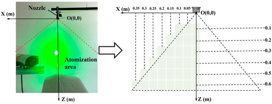 The experiments were conducted in a controlled environment to minimize the influence of external factors. The experiment was conducted under the enclosed space without wind and light, and the temperature was maintained at 20–22 °C with a humidity range of 20–50%. The controlled environment ensured that droplet evaporation could be neglected. This study focused on a basic model of a fan spray area for agricultural spraying applications. Considering the effect of gravity, the nozzle was positioned vertically downward. A spatial right-angle coordinate system was established with the nozzle outlet center as the origin. The x-, y-axis-, and z-axes represent the long, short, and spray axes of the spray cross section, respectively. The droplets sprayed from the fan spray nozzle are approximately distributed in a plane, so the measurement is mainly focused on the droplet characteristic parameters in the X, Z plane.