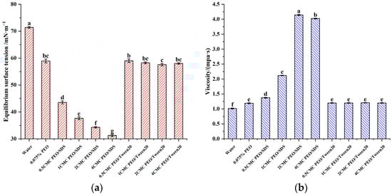 Viscosity and equilibrium surface tension distribution of solutions with different concentrations adjuvants. (a) Viscosity distribution graph. (b) Equilibrium surface tension distribution graph. (Note: The graphs a–g are arranged according to the size of all means, with a representing the largest mean, and where there is a letter with the same labeling, the difference is not significant, and where there is a letter with a different labeling, the difference is significant.).