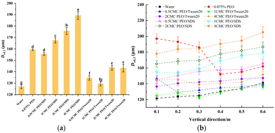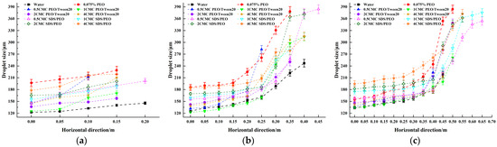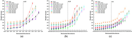 To obtain average droplet sizes on the Z-axis cross-section, the sizes in different sub-areas on the Z-axis were weighted and averaged by using the number of droplets. At a pressure of 250 kPa, the droplet size distribution below the LU-120-03 nozzle in the vertical direction for different adjuvants combinations is shown in Figure 5a. There was a 26.24% increase in droplet size in the Z-axis cross-section with the addition of 0.075 wt% PEO adjuvant alone as compared to water. The addition of small amounts of polymer molecules to sprayed liquids has been shown to result in the formation of larger droplets [30,31]. The main reason for this is that the addition of PEO increases the viscoelasticity of the solution and forms a film between the water and air, reducing the dynamic surface tension, which means that there is less of an energy barrier to droplet formation, resulting in an increase in the droplet sizes formed by the rupture of the liquid film. In addition, PEO can change the flow properties of water, making it easier for droplets to merge during formation and movement, leading to an increase in droplet size. When Tween20 was added to the PEO solution, the droplet size was significantly reduced and the size was close to that of water; furthermore, increasing the concentration of Tween20 had a small effect on the droplet size. The PEO/Tween20 mixtures at different CMCs have equilibrium surface tensions and viscosities relatively close to water. In addition, the dynamic surface tension of the mixtures in the first milliseconds of the atomization should be much closer to the water equilibrium surface tension, so the experimental results are simply the expected ones. For the PEO/SDS combination, as the SDS concentration increases, the equilibrium surface tension of the polymer decreases, viscosity increases, and droplet size increases accordingly. When the PEO/SDS concentration reaches 4CMC, the droplet size increases by about 47% compared to water, demonstrating a significant increase in droplet size. Thus, for polymer/associative surfactant combinations, it is possible to increase the droplet size by increasing the amount of the associative surfactant.