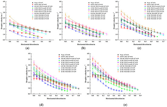 An analysis of droplet velocities was conducted at a distance of 0.6 m below the nozzle, and the droplet velocity distribution at z = 0.6 m under different pressures is shown in Figure 9. The solid lines represent the fitted relationships between droplet velocity and the numerical x value on the x-axis. Under different pressure conditions, the droplet velocities of the various adjuvants gradually decrease along the horizontal direction, and at the same position, the droplet velocity is proportional to the pressure. The droplet velocity in the atomization of the PEO/SDS solution is significantly higher compared to the pure PEO solution, while the droplet velocity in the atomization of the PEO/Tween20 solution tends to decrease compared to water. The velocity of droplet motion is influenced by the difference between two interacting forces: the initial momentum of the liquid jet and the air resistance of the surrounding gas. The initial velocity of the liquid is high, but as the spray area moves and the number of atomized droplets increases, along with the increase in total surface area, the kinetic energy of the liquid gradually weakens due to friction with the environment. When the kinetic energy of the droplets is finally depleted, the droplets move with the motion of the surrounding gas or fall under the influence of gravity. The greater the injection pressure, the greater the initial sheet velocity and, consequently, the higher the velocity of the droplets. The droplet velocities for different adjuvant combinations were fitted with a quadratic polynomial function based on the numerical values on the x-axis, resulting in velocity models with R2 values exceeding 0.9, indicating high accuracy. The fitted model is shown in Equation (5), and the fitting parameters and statistics for the model at a pressure of 250 kPa are presented in Table 2.