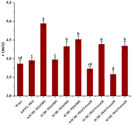 The distribution of the droplet velocities of the different adjuvant combination solutions in the vertical direction below the LU-120-03 nozzle at a spray pressure of 250 kPa was obtained by weighted average processing, as shown in Figure 10. The droplet velocity increased significantly with the addition of SDS to the PEO solution, with the greatest increase in droplet velocity relative to water being 27.9% at a concentration of 0.5 CMC. The change in droplet velocity with respect to water was not significant with the addition of 1 CMC SDS, and the droplet velocity gradually increased with the increase in SDS content. From the previous analysis, it can be seen that the droplet size formed by the atomization of the PEO/SDS solution increased significantly compared with PEO, which caused the droplets formed by atomization to have a larger initial kinetic energy and the speed of the droplets in the process of movement by the influence of air resistance decayed more slowly. As a result, the droplet velocity was greater under the same conditions. The regularity presented by the addition of Tween20 to PEO is not significant enough, and more solutions with different concentration gradients may be needed for further investigation. At a concentration of 1CMC, the droplet velocity increased by 13.5% relative to water. Larger droplet velocities are needed in application because they increase the penetration of the solution, increase the application effect, and reduce the drifting phenomenon of the solution. Polymer/associative surfactant types were prioritized in the adjuvant selection process.