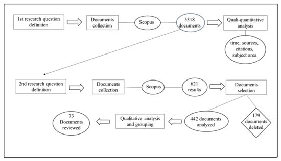 According to the aim of the paper, a systematic and bibliometric review of the literature on the expression Medicinal and Aromatic Plants was conducted to outline the geographical focus of the literature; how the academic world approaches the study of MAPs; and what the current and future research lines are. As stated by Denyer and Tranfield [43] and Merli et al. [44], this type of analysis allows for providing a transparent and reproducible process of selecting, analyzing, and reporting on the previously conducted research on a specific topic. As in other studies [43,44,45,46], the review process followed some steps: research questions definition; documents collection; quali–quantitative analysis; documents selection; qualitative analysis and grouping; and documents evaluation (Figure 1).