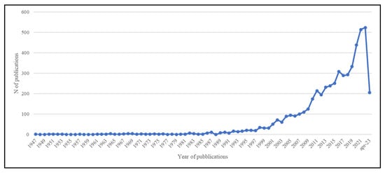 At the same time, although the academic world began talking about MAPs in 1950, it was only in the 1990s that the interest in this topic began to be recognized, which has increased from the 2000s to today. Indeed, since the 2000s, there has been an increase in academic publications about MAPs, and the year with the highest number of results was 2021. As stated by Muley and Medithi [52], this could have been due to the COVID-19 pandemic, when the interest of researchers focused on improving immunity using medicinal and aromatic plants, an interest which was then maintained—at least in Europe—thanks to the Green Deal and the role that MAPs can now have in the search for new natural products that can be used in all sectors to make the European Union more ecological, sustainable, and competitive.
