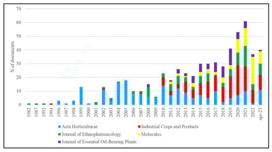 Figure 4 shows that, considering the five sources with the highest share of publications, Acta Horticulturae (the book series with the highest number of publications in absolute) maintained leadership until 2012, while Industrial Crops and Products has incremented its contribution to the MAPs topic since 2013. The Journal of Ethnopharmacology published its first article back in 1982, but has contributed significantly to the research topic in the last years. Molecules, present since 2011, contributed significantly only starting in 2020, confirming the growing interest in MAPs also from other sectors (chemistry). On the contrary, the scientific contribution of the Journal of Essential Oil-Bearing Plants was concentrated from 2014 to 2021.