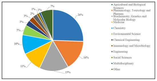 Referring to the subject areas, those most represented were Agricultural and Biological Sciences (2497); Pharmacology, Toxicology, and Pharmaceutics (1571); Biochemistry, Genetics, and Molecular Biology (1513); Medicine (1035); and Chemistry (1003), representing together 78% of the total (Figure 5).