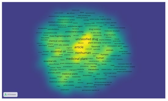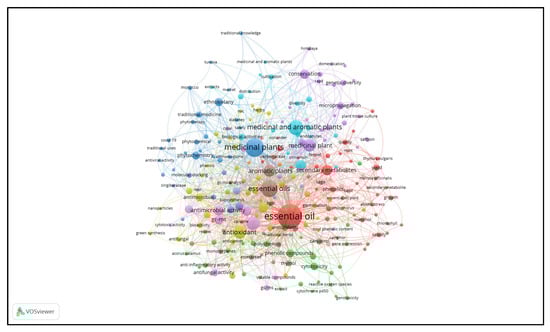 From the co-word analysis of all the keywords of the 5318 collected documents, the “complexity” of the concept of MAPs emerged. Indeed, the descriptive analysis carried out through the co-occurrence networks showed that the semantic cores of this complexity were the biochemical and analytical aspects, although the agronomic and genetic aspects, as well as the ethnobotanical ones, were present with a certain importance. Furthermore, the top five most recurring words were: article (occurrences: 1576), nonhuman (occurrences: 1492), medicinal plant (occurrences: 1376), unclassified drug (occurrences: 11,111), and essential oil (occurrences: 1091) (Figure 6).