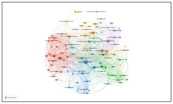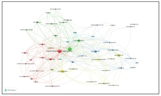 Co-word (author keywords co-occurrence) network visualization map: focus on the keyword “medicinal and aromatic plants”.