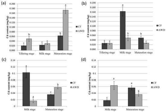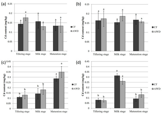 3.2. Effect of Water Management on Cd Accumulation in Rice Plants