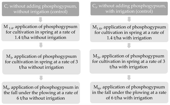 The practical experience of using phosphogypsum under the conditions of the Steppe zone of Ukraine (Haplic Chernozems) is represented by a small number of scientific publications [14,16,32]. Therefore, we hope that this study can be useful in expanding scientific knowledge and approaches in the fight for the ecological improvement of soil cover in similar climatic zones and conditions of irrigated agriculture.