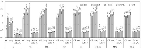 The results of our own research on the chemical composition of water extract in meq/100 g of soil for the years of observation are presented in Table 6. The type of salinity based on the anion composition is sulphate for all experimental variants and for all years of observation is presented. An exception is the variant Ci in the fifth year of the study with chloride–sulphate salinity. This is explained by an increase in the indicator of toxic ions equivalent to chlorine (2.08 meq) (Figure 2).