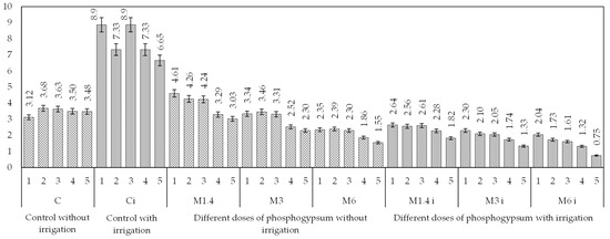The most dangerous compounds for the growth and development of plants are precisely those containing chlorine. It has been proven that an excessive amount of salts in the root zone of the soil leads to an increase in osmotic pressure, reducing the water absorption capacity of plants and the accumulation of specific toxic ions in them [57,58,59]. All chlorine salts are toxic to agricultural crops. The increase in chloride ions is explained by their influx with irrigation water. We observed a clear tendency for an increase in chlorine ions in irrigated experimental variants over the years of research. The control irrigated plots had 33% more chloride ions compared to non-irrigated variants. The application of phosphogypsum during irrigation reduced the concentration of Cl by 13–34% compared to the irrigated control variant.