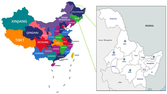 Heilongjiang Province is the largest soybean production region in China. In 2022, its soybean planting area reached 492.67 thousand square hectares, accounting for 48.1% of the national total. Its soybean production reached 9.54 billion kilograms, accounting for 47% of the national total, ranking first in the country. In order to make the experiment more representative, samples were selected from the five major soybean production areas in Heilongjiang Province: Heihe, Qiqihar, Jiamusi, Suihua, and Harbin. Figure 1 shows the soybean collection area. The soybeans were harvested uniformly on 30 September 2021. After four days of air drying, they were stored in a low-temperature environment. For this experiment, 85 soybean varieties were selected, including Jiami 12, Jiami 13, Heihe 33, and Heihe 43. Each group of samples consisted of 100 uniformly sized and undamaged soybeans.