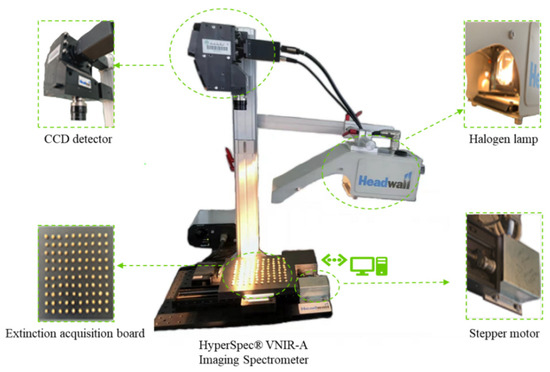 The experiment was conducted in the Hyperspectral Image Processing Laboratory at the College of Electrical and Information Technology, Northeast Agricultural University. The hardware system included the Hyperspec® VNIR hyperspectral imager, which consists of a camera with a CCD (charge-coupled device) image sensor and a spectrometer with a VNIR (visible/near-infrared) spectral range, as well as a motor-controlled transport platform and a halogen lamp. The hyperspectral images were collected by Hyperspec Ⅲ software, with a spectral range of 400.92–999.53 nm. After interference factors were removed from the raw data, the spectral range was 463–957 nm, with a bandwidth of a 1 nm interval. A total of 495 spectral bands were collected. During the sample collection, firstly, the instrument was preheated for 20–30 min to ensure a stable light source. In order to meet the requirement of maintaining good stability for the soybeans throughout the testing process, the soybeans were evenly placed in a self-made 10 × 10 mobile platform with a completely black background. Then, the hyperspectral images were acquired at a speed of 3.6 mm/s. The range for sample manipulation was set from 30 mm to 180 mm. If an obvious distortion occurred during this process, a remeasurement was performed. The experimental procedure is illustrated in Figure 2.