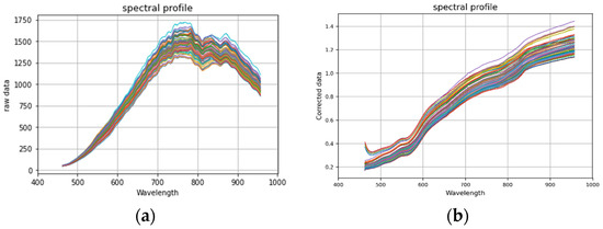 Spectral curves of soybean samples: (a) original spectral curves of soybean samples; (b) spectral curve of soybean sample after correction.