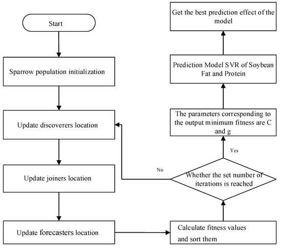 In this study, we demonstrated the significant advantage of the CARSSPA algorithm, which integrates CARS and SPA, in dimensionality reduction. Through the competitive adaptive reweighted sampling by CARS and stepwise information feature selection by SPA, this algorithm effectively eliminates redundant features while retaining essential information, thereby substantially improving the accuracy and efficiency of model predictions. The applicability of PLSR, RFR, and SVR models for predicting the soybean fat and protein contents was evaluated, confirming their effectiveness. Additionally, the study highlights the importance of parameter optimization in enhancing the model performance, showcasing the superiority of heuristic search algorithms over the traditional grid search in optimizing predictive performance. Particularly noteworthy is the heuristic optimization algorithm inspired by the foraging behavior of sparrows used in this research, which, through the chaos initialization, interference enhancement during the search process, and an adaptive adjustment mechanism, significantly speeds up the model convergence during training, enhances the optimization efficiency, and further improves the accuracy of the fat and protein content predictions.