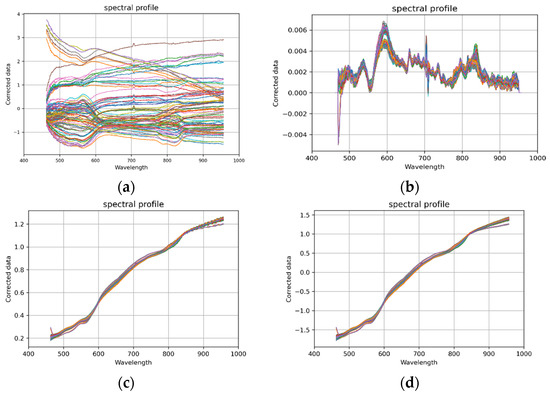Pretreatment spectral curve. (a) Center norm. (b) First derivative. (c) MSC. (d) SNV.