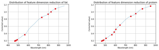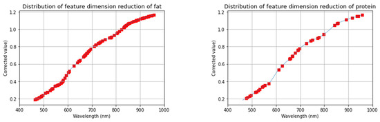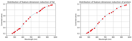 Figure 7 illustrates the CARS feature selection process for both fat and protein. As the number of iterations increases, the corresponding RMSECV first decreases and then increases. The red vertical line in the figure indicates the minimum number of iterations. For the fat, when the number of iterations was 14, the RMSECV reached its minimum value of 0.3179, with a corresponding optimal combination of 103 bands. The coefficient of determination (R2) for the fat reached 0.879. On the other hand, for the protein, the RMSECV was minimized at the 23rd iteration, with the smallest RMSE and a combination of 37 features. The corresponding Rp2 for the protein was 0.8518. The CARS feature selection process for the fat and protein is presented in Figure 7, and the distribution in the original spectrogram is depicted in Figure 8.