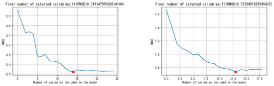 Figure 9 illustrates the screening process for the fat and protein variables using SPA. The RMSE initially decreases, then increases, and eventually stabilizes. For the fat variable, the minimum RMSE of 0.3191 was obtained when the number of variables was 14. The distribution of the selected characteristic variables is shown in Figure 10. Similarly, for the protein feature selection, the RMSE reached its minimum value of 0.7325 when the number of variables was 13. Remarkably, the band selection process resulted in compressing the variables to only 2.6% of the full band.