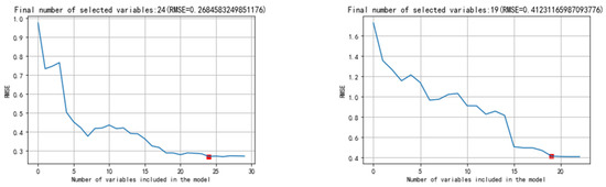 Figure 11 shows the process of screening the fat and protein variables using the CARSSPA algorithm. The RMSE in the PLSR model is used as the evaluation index. For the fat variable, the RMSE reached its minimum value of 0.2685 when the number of variables was 24. Similarly, for the protein variable, the RMSE achieved its minimum value of 0.4123 with 19 characteristic bands. The distribution of the selected feature variables is shown in Figure 12.