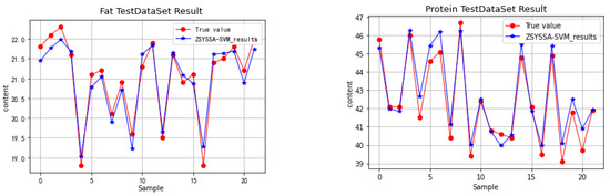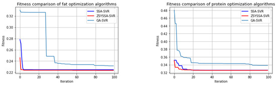 The adjustment of parameters C and g by three optimization algorithms has improved the performance of the model. For the fat variable, the improved SSA optimization of SVR achieved a 3.92% increase in Rp2 compared to ordinary SVR, along with a decrease in RMSE by 0.0641. The optimal values for C and g were found to be 1.75577165 and 0.3684816, respectively. Compared with GA and SSA, the Rp2 increased by 0.43 and 0.06, respectively. Regarding the protein variable, the ZSYSSA optimization algorithm yielded the best results, with the optimal value of ‘C’ being 30.68672218 and that of ‘g’ being 0.16808313. The optimized Rp2 values were ranked as ZSYSSA > SSA > GA, and the RMSE values were ranked as ZSYSSA < SSA < GA. Although the improvement in Rp2 with ZSYSSA was not significantly different from SSA, Figure 13 demonstrates that the optimal solution was achieved with fewer iterations, indicating a faster convergence speed compared to SSA.