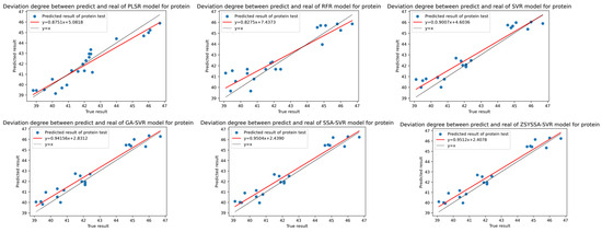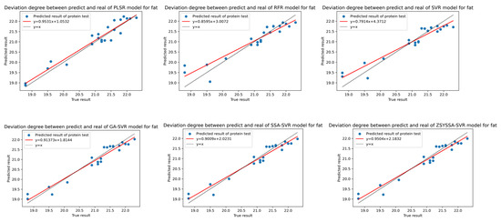 The deviation degree between the actual value and the predicted value could well reflect the fitting effect of the model. The following figure shows the regression of the fat and protein under different models; the closer the regression line was with respect to y = x, the better the performance is. Figure 14 and Figure 15 show the deviation degree between the actual value and the predicted value of the fat and protein.
