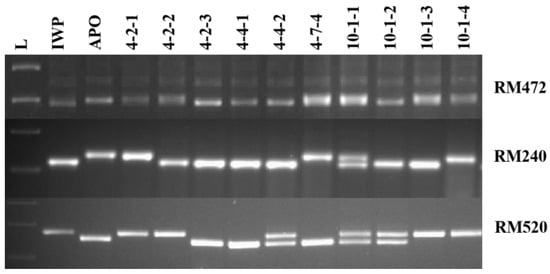 IWP BILs were developed using the marker-assisted backcross breeding scheme (Figure 1). Fresh leaf samples were collected, and DNA was isolated by following the modified CTAB method [25]. DNA fragments were quantified using a nanodrop spectrophotometer (ND 1000, Wilmington, DE, USA), and polymerase chain reaction (PCR) products were separated in 3% agarose gel electrophoresis. DNA profiles from such markers were scored in comparison with their parents. The foreground selection was carried out using three SSR markers, such as RM472, RM240, and RM520 (Table 2). These markers are linked with the target QTLs, viz. qDTY1.1, qDTY2.1, and qDTY3.1, respectively. A total of 72 genome-wide SSR markers, spanning all 12 chromosomes, were used for the background selection (BGS) process.