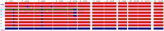 Graphical representation of IWP BILs showing the extent of IWP genome recovery. The red color represents homozygous regions for Improved White Ponni (recurrent parent). The blue color represents homozygous regions for Apo (donor parent). Progenies—1: 10-1-1-5-23; 2: 4-7-4-24-3-4-12; 3: 4-7-4-24-3-4-15; 4: 4-7-4-24-3-4-17; 5: 4-7-4-24-4-16-28; 6: 4-7-4-24-4-16-29; 7: 4-7-4-24-4-16-30.