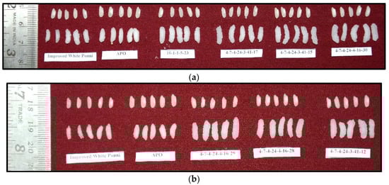 (a) Comparison of the cooking quality of BILs with IWP–IWP, APO, 10-1-1-5-23,4-7-4-24-3-17, 4-7-4-24-3-15, and 4-7-4-24-4-30. (b) Comparison of the cooking quality of BILs with IWP–IWP, APO, 4-7-4-24-4-29, 4-7-4-24-4-28, and 4-7-4-24-3-12.