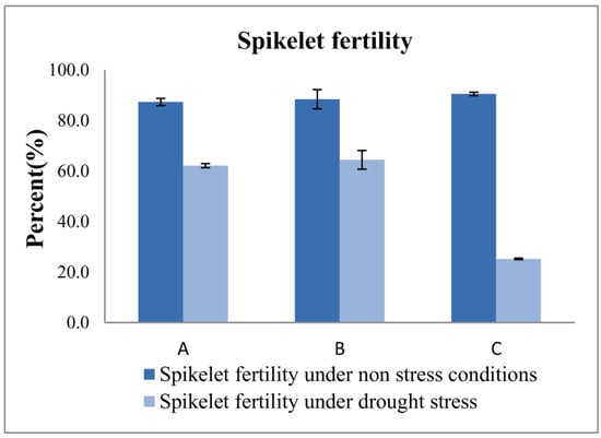 Mean spikelet fertility of both IWP BILs and IWP. QTL combinations: A: qDTY1.1 + qDTY3.1; B: qDTY2.1+ qDTY3.1; and C: IWP.