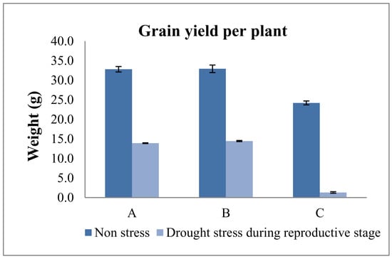 The selected BC2F4 and BC3F4 BILs were evaluated for tolerance under drought conditions (Figure 6). Table 5 and Table 6 show the combined and individual yield performances of the seven most promising drought-tolerant IWP BILs. The recipient parent, i.e., IWP, either did not flower at all or produced a negligible yield. The differences in the DTF of IWP BILs and IWP under control and drought stress conditions were considerable. The IWP BILs were 22.9–26.9 days earlier under drought conditions and 8.6–13 days in the case of irrigated controls. The mean spikelet fertility of IWP BILs was higher (63.3%) than the IWP (25.2%) under drought stress (Figure 7). The grain yields (GY) of the selected IWP BILs were in the range of 11.4 g to 17.1 g under drought and 30.5–34.6 g per plant in the case of irrigated controls (Figure 8). The IWP produced negligible or no GY at all under drought (1.3 g). However, under control, the mean grain yield of the IWP was 24.2 g per plant (Figure 9).