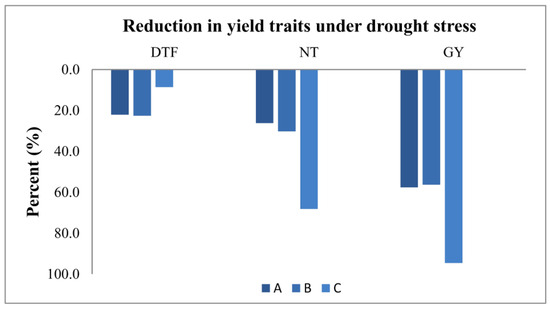 Reduction (%) in the yield traits of QTL classes of IWP BILs. Days to flowering (DTF), number of tillers (NT), and GY (single plant yield); QTL combinations: A: qDTY1.1 + qDTY3.1, B: qDTY2.1+ qDTY3.1; and C: IWP.