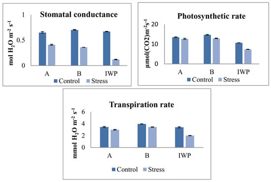 Further, the gas exchange parameters were measured during drought stress. As expected, the drought treatment led to a significant reduction in various parameters, such as the net photosynthetic rate, stomatal conductance, and transpiration rate (Table 7). However, the photosynthetic rate was found to be constitutively higher in the IWP BILs than the IWP (Figure 10). It is important to note that a remarkably-high photosynthetic rate was achieved in these lines, despite transpiration and low average stomatal conductance (Figure 10) under drought.