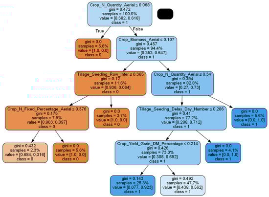 Figure 2, for instance, depicts a Decision Tree randomly selected from the Cowpea dataset based on the RF model. The Decision Tree reveals that each node’s division condition is the feature selection condition. Features closer to the root node in the Decision Tree are of greater importance and play a pivotal role in the division of classification results. The data flow process within the model is clearly visible from the Decision Tree. The samples in the training set are divided according to the root node’s value condition, Crop_N_Quantity_Aeria0.068. Samples with a value less than 0.068 enter the left child node, while those with a value greater than or equal to 0.068 enter the right child node. The term “samples is 100%” indicates that the node encompasses the entire training dataset. The value [0.382, 0.618] represents the proportion of samples with category 0 and category 1 in the node, while “class = 1” signifies that the node’s predicted category is 1. The left node, a leaf node, lacks characteristic conditions, indicating that no further division is required. A gini index of 0 signifies that the node’s impurity is 0, and all samples belong to the same category. The right node is further divided based on the sample’s “Crop_Biomass_Aerial” feature value: if the sample’s Crop_Biomass_Aerial” is less than 0.107, it enters the left child node; if it is greater than or equal to 0.107, it enters the right child node. The sample’s category 0 proportion is approximately 35.3%, while category 1 accounts for about 64.7%, hence the node’s predicted category is 1. This division process continues until the entire Decision Tree is divided, with each node assigning samples to different sub-nodes based on feature conditions and predicting the final category. Thus, the Decision Tree can determine the sample’s category based on the feature value, providing an intuitive method to explain the data flow understanding process.
