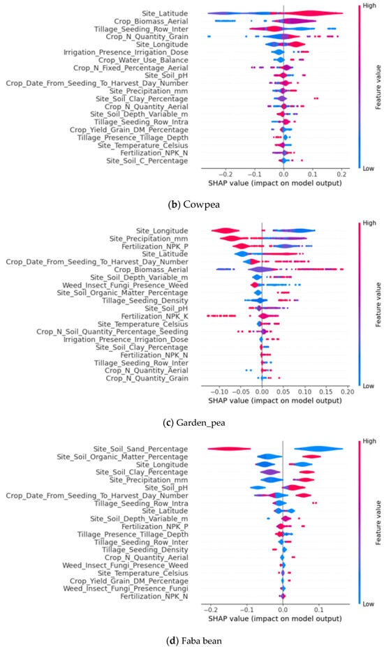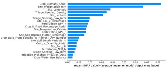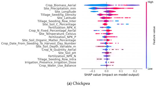 Taking the feature importance map of Chickpea as an example, Figure 3 displays the results of the SHAP values sorted in descending order post RF model training. This figure illustrates the 20 important features selected from a total of 38 features. By comparing the SHAP values of the different features, it becomes evident that these important features exert a substantial impact on the model output. Among them, the aerial biomass of crops, the precipitation at the experimental point, and the longitude of the experimental point are the three features that most significantly influence the yield of Chickpea. The concordance of these findings with the SHAP summary graph (refer to Figure 4a) serves to reinforce the significance of these features within the model.