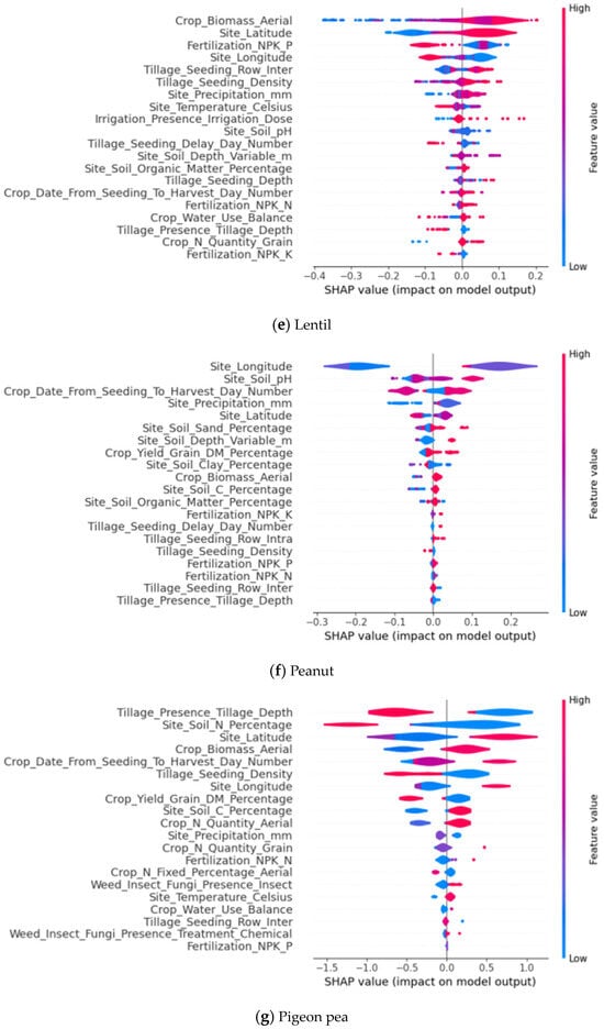 The lentil graph (Figure 4e) shows that the latitude of the experimental sites positively impacts yield, with higher latitudes generally having shorter growing seasons. Lentils are early maturing crops with a relatively short growing period, typically around 70 to 120 days, and can complete their life cycle within a brief growing season. Additionally, the yield of lentils negatively correlates with the dosage of phosphorus fertilizer. This may be due to an excess of phosphorus fertilizer: although phosphorus is a crucial nutrient for plant growth and development, a high concentration of phosphorus fertilizer may disrupt the balance of the root system environment, interfering with the plant’s root system’s ability to absorb water and other nutrients, thereby affecting plant growth and yield formation.